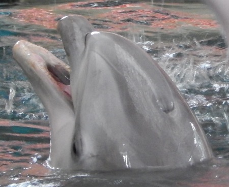 Der ärmste und immer kranke Delphin ist Yoanna, wie man auf den Fotos sehen kann, ist ihr kompletter Mundbereich grau, sie hat eine starke Pilzerkrankung, vermutlich Hefepilze, daher die graue Färbung im kompletten Mund und Rachenbereich.